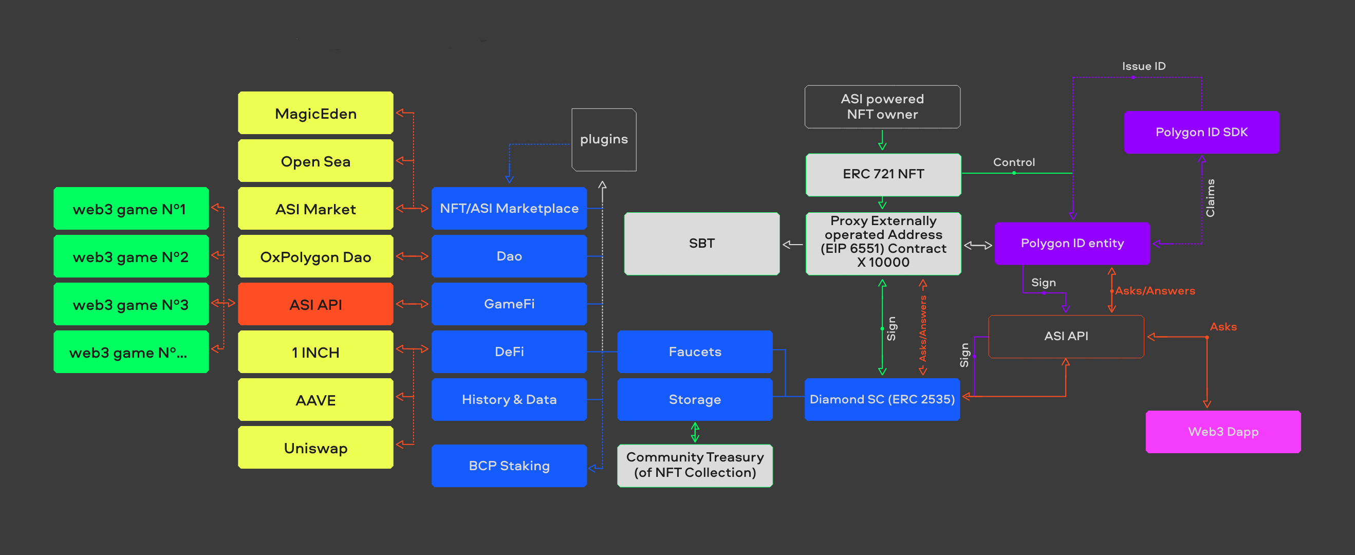 ASI is essentially a smart contract similar to ERC-2535: Diamonds, Multi-Facet Proxy. It enhances the NFT smart contract by creating a proxy for the main contract. This proxy can call known token and protocol standards with standard signatures and other methods. By adding and disabling faucets & plugins for various standards, ASI can evolve and adjust its functionality over time.