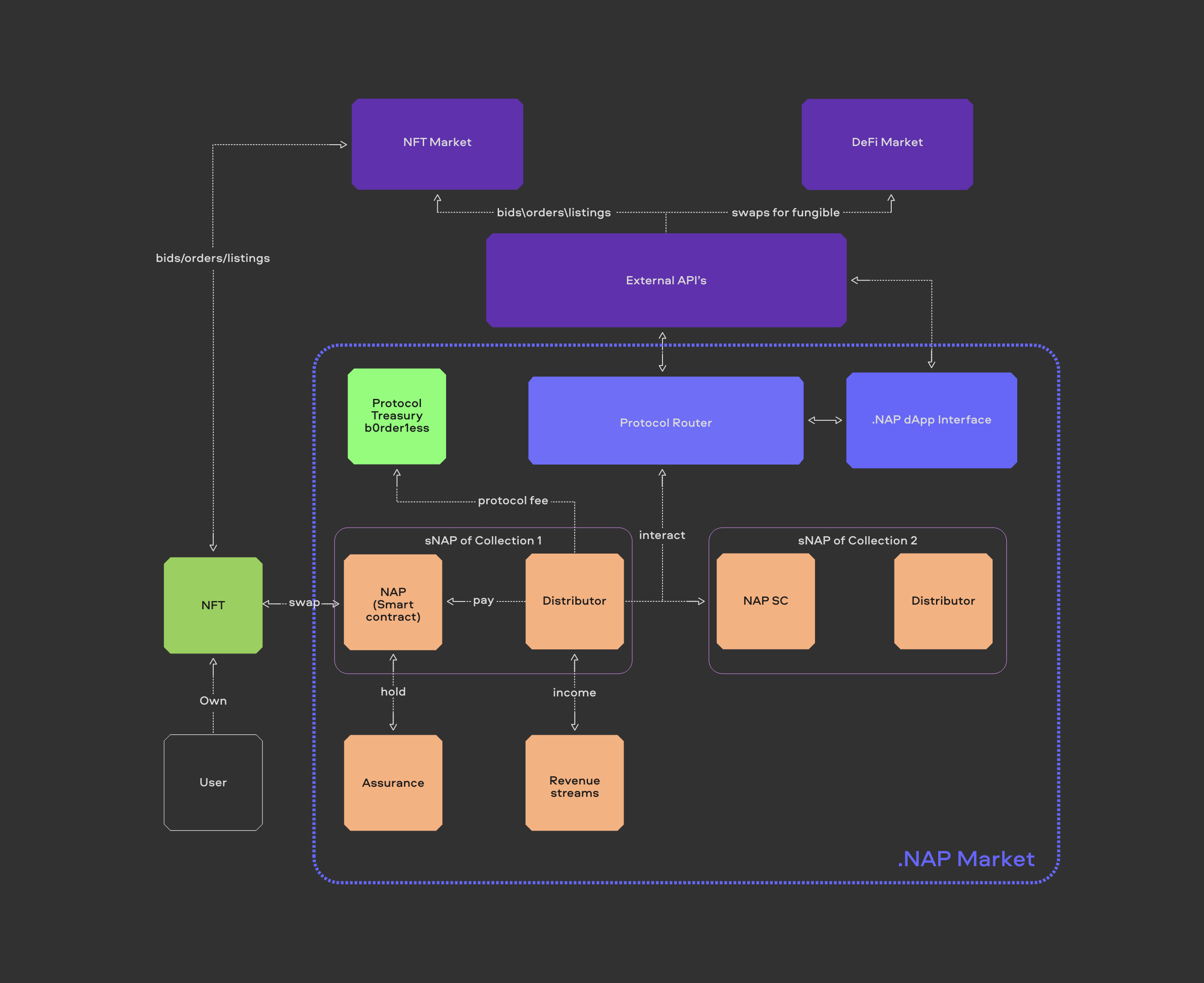 NAP allows users to exchange ERC 721 & ERC 1155 for the backed ERC-20 class token, and vice versa. Technically, NAP is a family of interacting smart contracts, first deployed on the Polygon PoS blockchain. This protocol includes a Factory smart contract that will set up, publish, and govern all NAP smart contracts for certain collections.